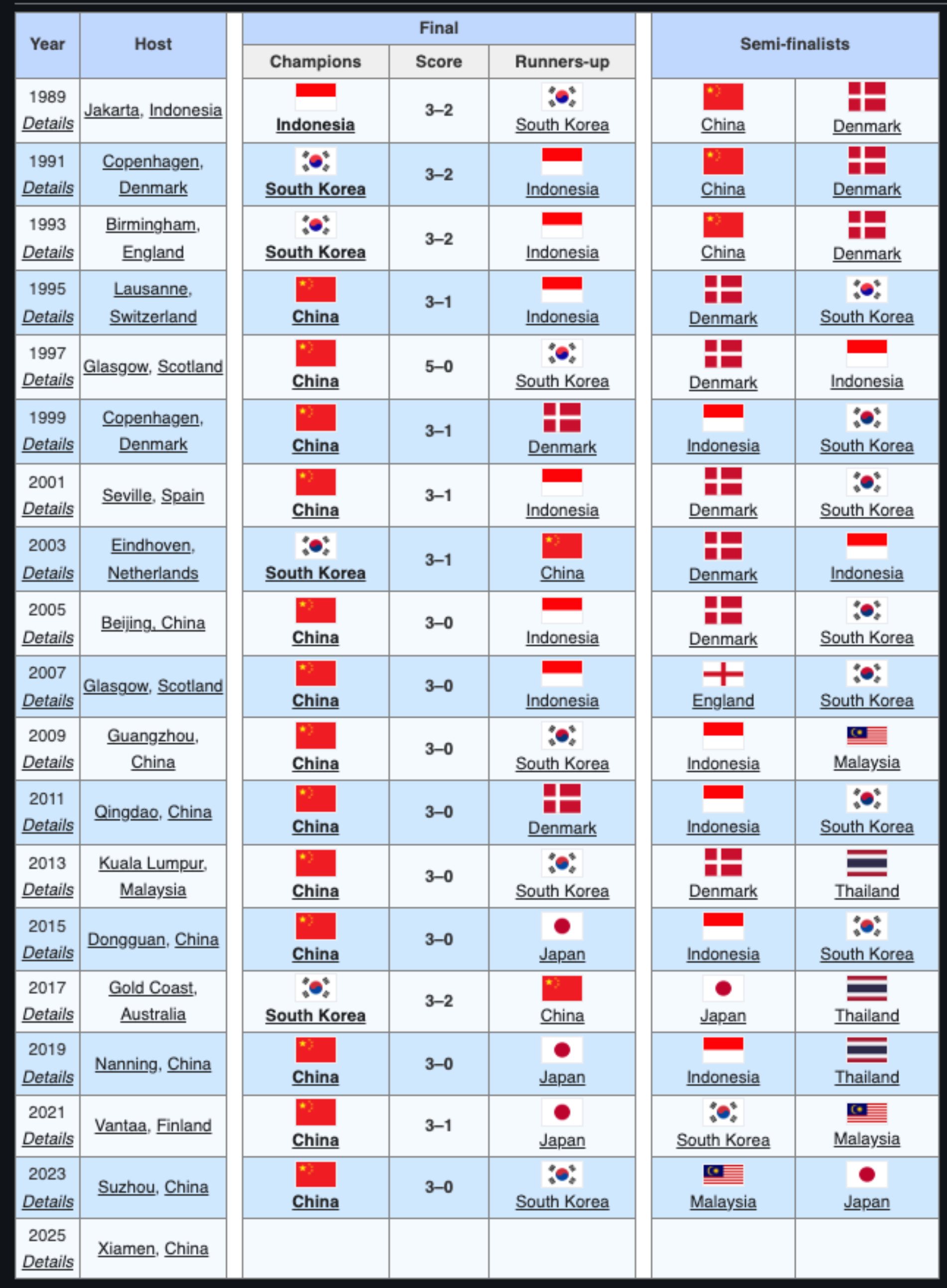 Selain terjadi pada dua tahun lalu, pertemuan China dengan Korea juga tercipta di Sudirman Cup 2017 (Korea vs China 3-2), Sudirman Cup 2013 (China vs Korea 3-0), Sudirman Cup 2009 (China vs Korea 3-0), Sudirman Cup 2003 (Korea vs China 3-1), Sudirman Cup 1997 (China vs Korea 5-0).