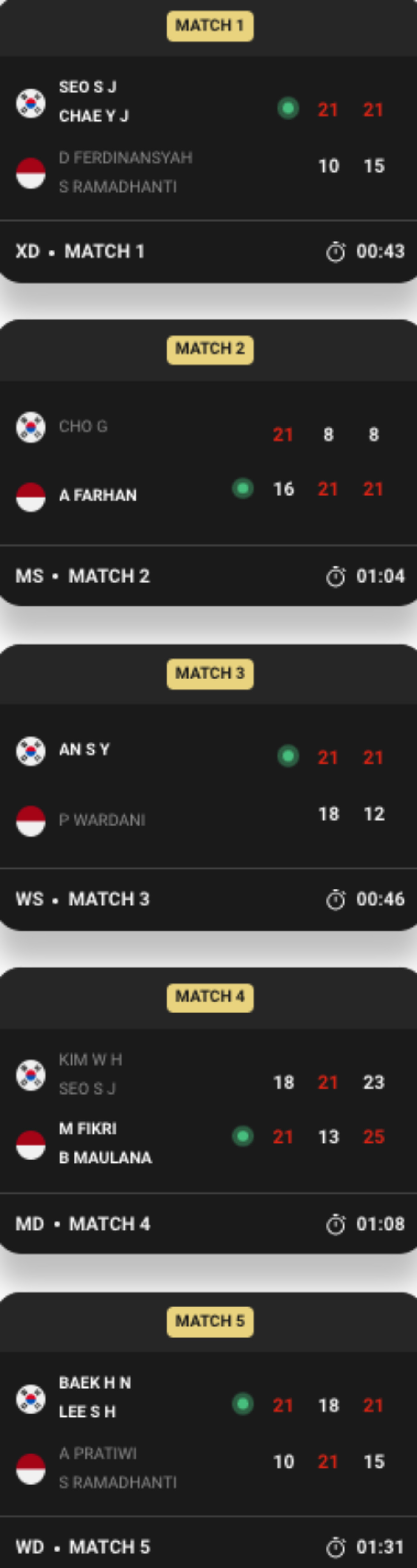 Laga Korea vs Indonesia harus diputuskan dalam lima match.