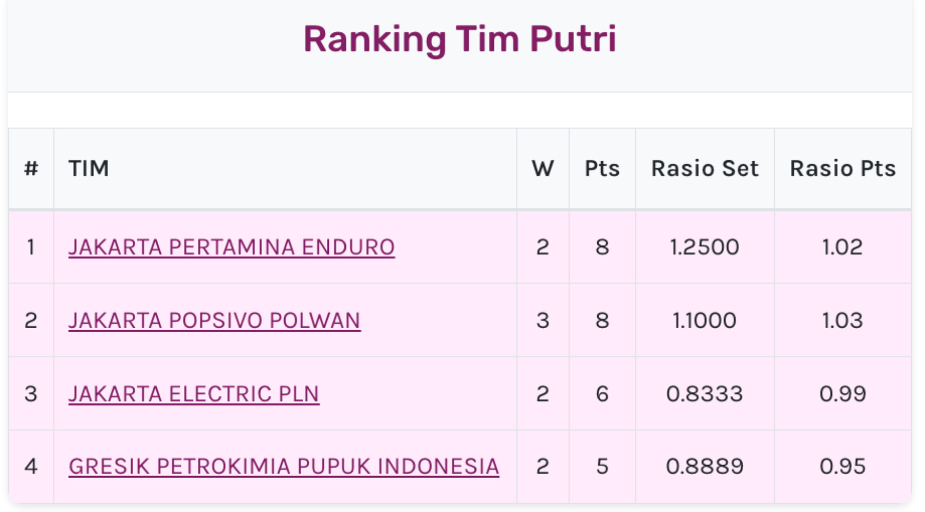 Klasemen Sementara Final Four Proliga 2025 Putri