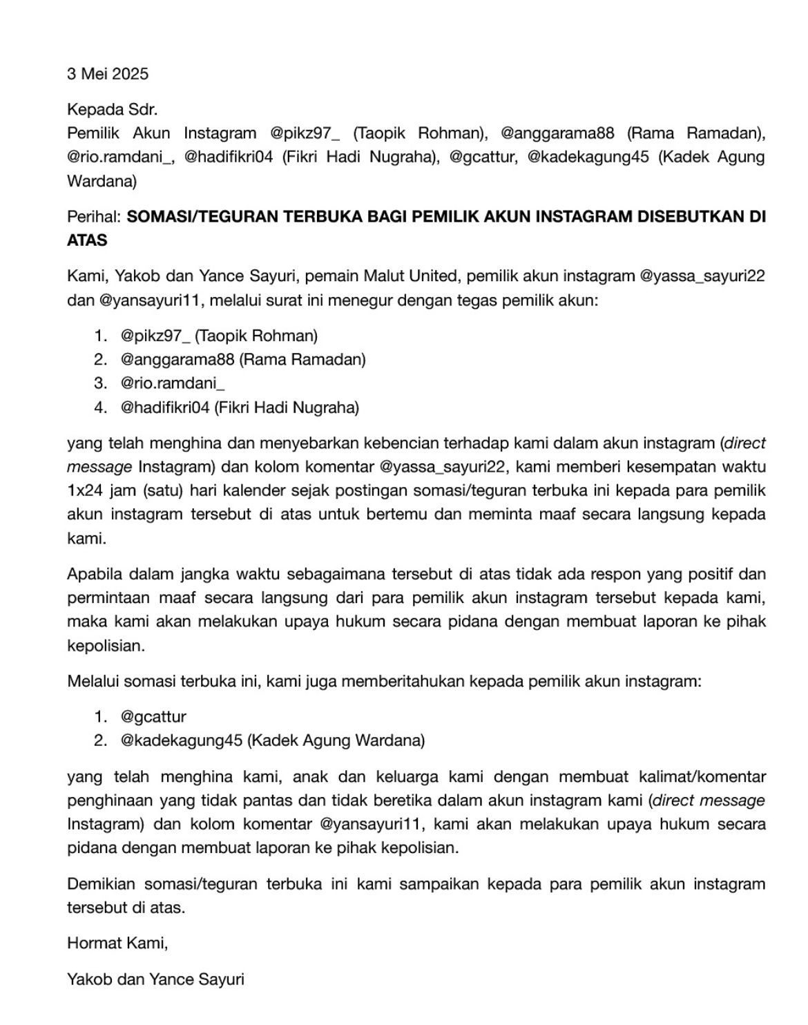 Yakob dan Yance juga membuat surat terbuka kepada akun instagram pikz97_, Anggarama88, rio.ramdani_, hadifikri04, gcattur, dan kadekagung45.